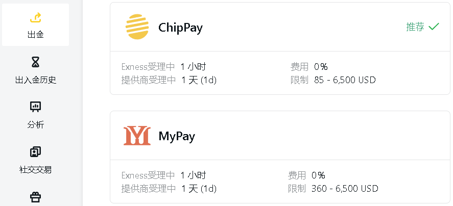 1、登录网站,使用电脑浏览器或手机浏览器都可以出金,点击出金中的CHipPay,或者MyPay,一般平台推荐的方式渠道比较受欢迎和稳定。