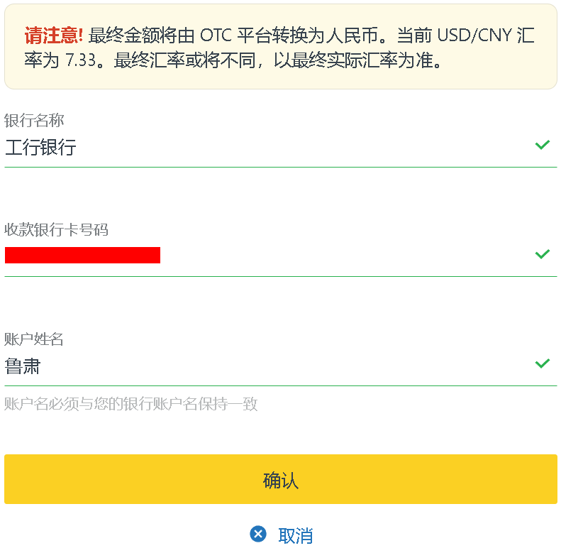 5、输入银行名称,银行卡户头信息。收款姓名必须和注册资料姓名相同,支持中文填写。填错资料,订单处理时会失效,届时就需要重新提交新的正确的提款单。