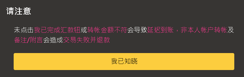 - 请您在规定时间内完成汇款后【务必点击“我已完成汇款”按钮】,以确保即时到帐。