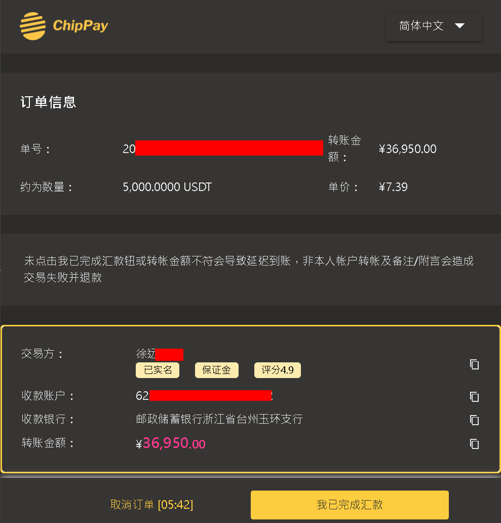 - 您的汇款将直接转入交易方银行账户,交易过程中交易方出售的数字资产由平台託管保护,请放心交易。