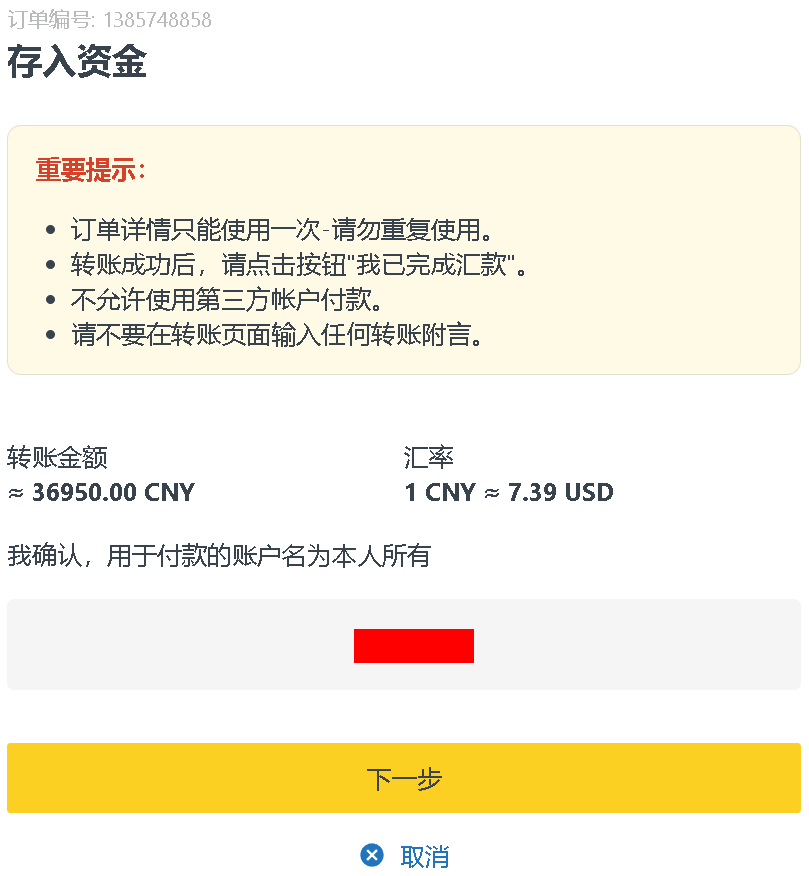- 每笔订单收款信息仅单次有效,【请勿保存信息进行二次转账】。