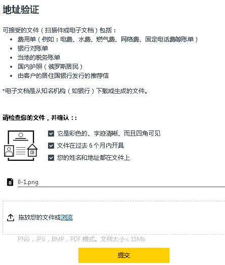 10、身份验证审核通过后,再进行地址验证,带有地址的银行账单、水电暖、燃气费、网费、车险单等等。已经用于身份验证的文件不能被用于地址验证。提交审核通过后,账户不会再提示2000美元的限制。